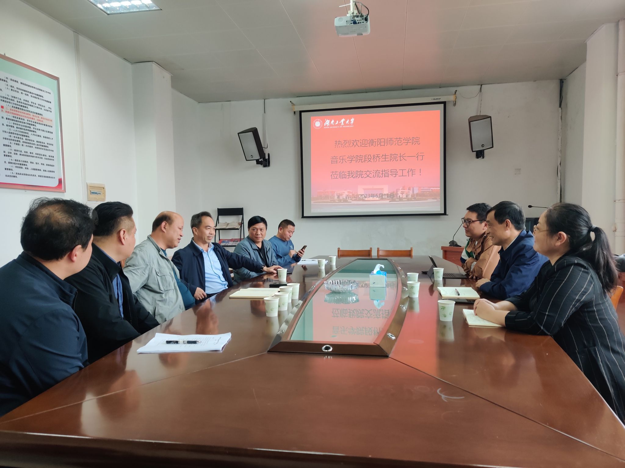 2023年5月11日,太阳成集团tyc151cc经理段桥生教授与副经理陈瑾、崔少博一行赴湖南工业大学太阳成集团tyc151cc交流。双方就艺术硕士(音乐)研究生人才培养、学科与专业建设、团队队伍建设等方面进行了广泛深入的沟通与探讨。