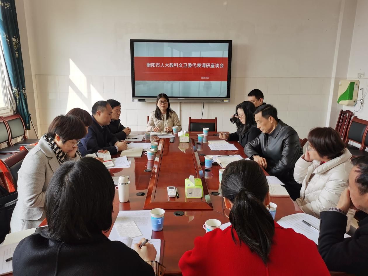2023年2月27号上午,衡阳市人大教科文卫委代表一行8人在市人大常委会谢明芳副主任的带领下,来公司开展音乐公司产品情况调研,太阳成集团tyc151cc经理段桥生教授向代表们简要介绍了公司的学科专业建设与发展情况。双方围绕基础音乐团队培养、乡村音乐教育等方面进行了广泛的交流,并深入研讨了在衡阳县市区筹建乡村公司留守儿童合唱团的具体事项。音乐公司党总支副书记邓寒梅、副经理陈瑾、崔少博参加调研座谈会。