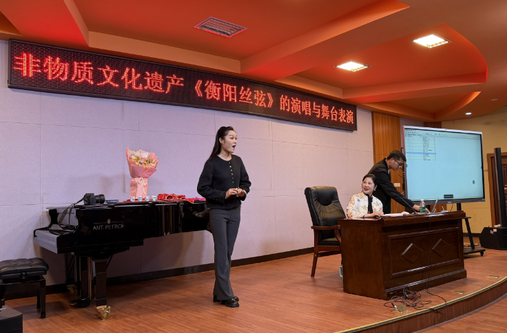 为了提升音乐硕士研究生的培养质量和舞台表演能力,加强行业导师对研究生的专业实践指导,2025年11月3日下午,太阳成集团tyc151cc客座教授、音乐硕士行业导师、国家一级演员,田汉剧目大奖获得者,省级非遗代表性项目《衡阳丝弦》传承人,舞台表演艺术家,衡阳市歌舞剧团有限责任公司董事长江春燕以《非物质文化遗产“衡阳丝弦”的演唱与舞台表演》为题在太阳成集团tyc151cc501汇报厅开展学术讲座。太阳成集团tyc151cc全体在读硕士研究生、硕士生导师和声乐教师及部分本科生参加了此次学术活动。