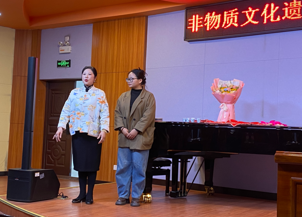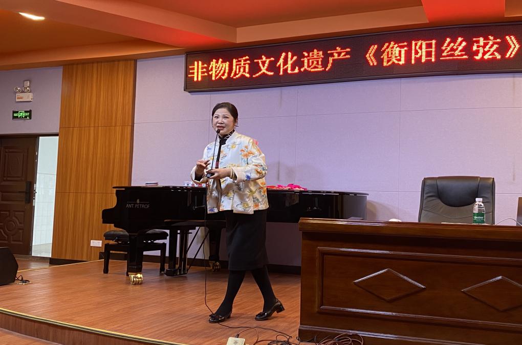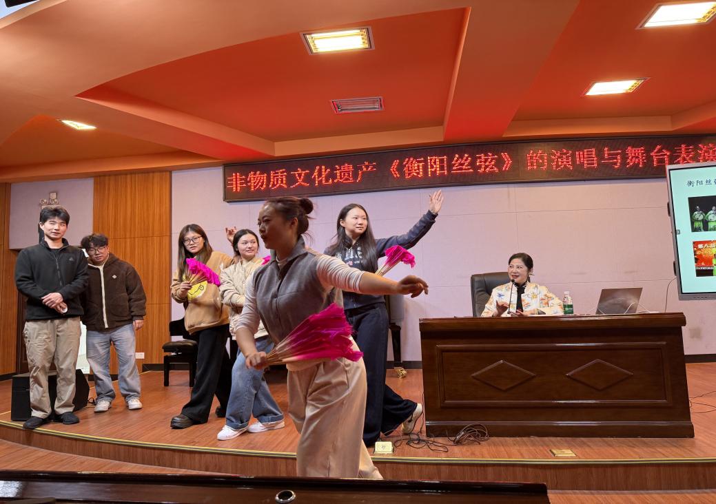 为了让同学们有身临其境的切身体验与感受,江老师与特邀的衡阳市歌舞剧团演员刘晶现场合作表演了衡阳丝弦《四季花儿开》。
