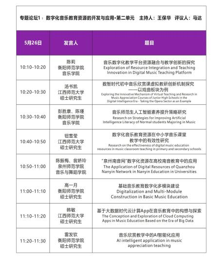 5月26日设4个分会场进行论文宣讲,分别讨论了数字化音乐教育资源的开发与应用、数字化音乐教育技术的创新与发展、数字化音乐教育与传统音乐教育的融合,以及数字化音乐教育在全球范围内的发展与挑战。公司员工陈莉在专题论坛1中宣讲了题为《音乐数字化教学平台资源融合与教学创新的探究》的论文,赵文婧则在专题论坛3中宣讲了关于《人工智能融入初中唱歌课大单元设计》的论文。公司员工在此次活动中获得了丰富的学术成长。