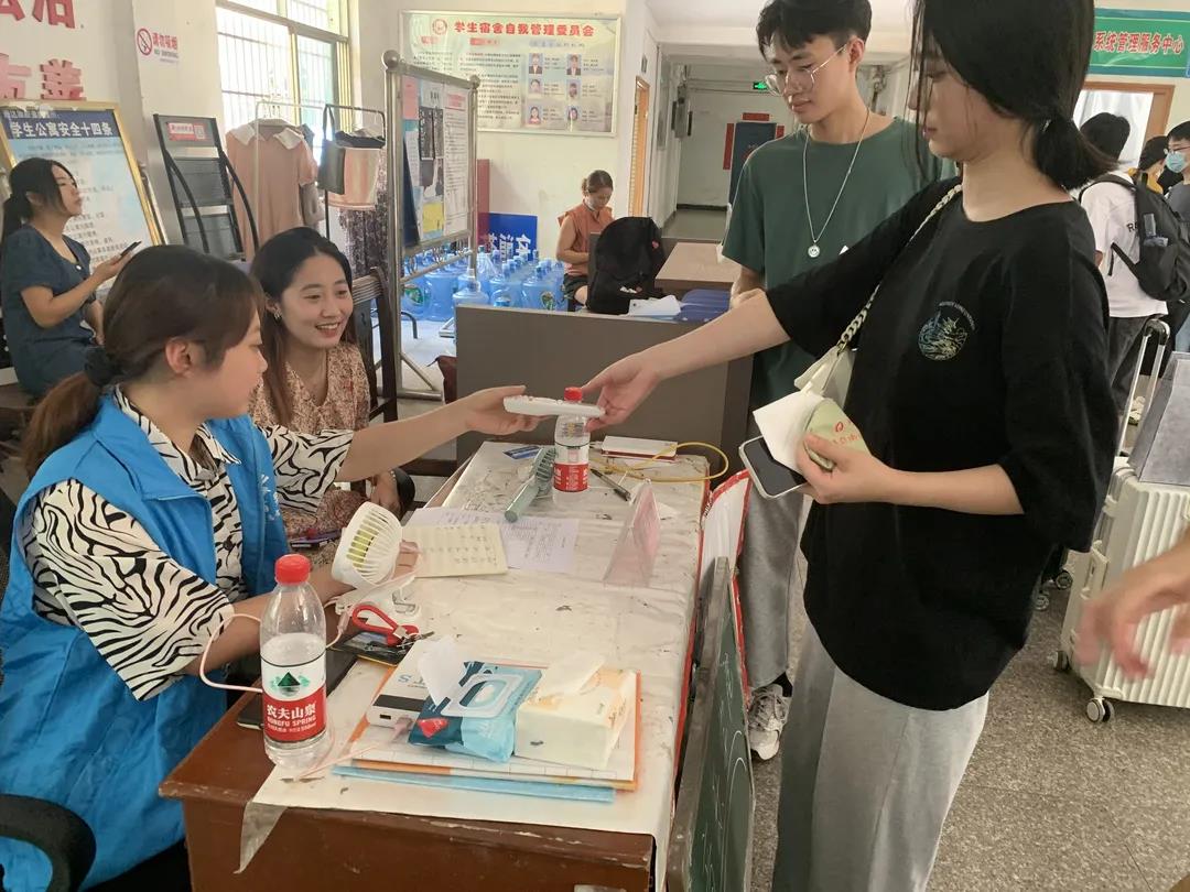 宿舍楼下,服务工作也在有条不紊的进行着。为了让新生们可以尽快安置好,志愿者们将空调遥控器贴上标签并一一摆放整齐。面对员工们的问题志愿者们耐心地给予解答,用认真的工作态度和温暖的话语迎接每一位新生。