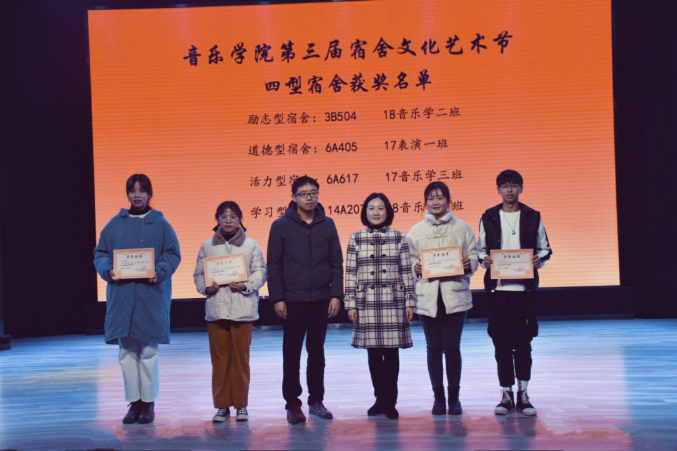 会议第二项,王老师对太阳成集团tyc151cc第三届宿舍文化节进行了总结,指出了存在的问题并给出了建议。并通过视频展示了“文明和谐示范宿舍的风采。随后,”陈雅斐副书记、王江南老师和黄鹤飞老师为获得“十佳寝室长”的同学颁奖,并为获得“四型寝室”和“文明和谐示范寝室”的寝室颁发荣誉证书。接着由女寝6A617,男寝3B504进行了经验交流,这不仅启发了同学们如何装扮寝室,还让同学们认识到寝室环境和文化的重要性。
