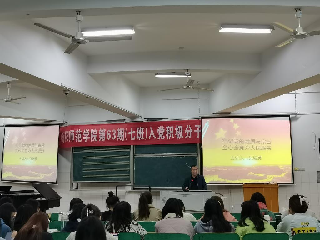 2021年4月8日晚19点30分,公司于音乐楼301教室举行了第63期入党积极分子培训班第三讲课--牢记党的性质与宗旨,全心全意为人民服务。本次培训由政策法规研究中心主任张波勇同志担任主讲人。