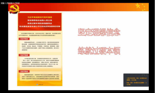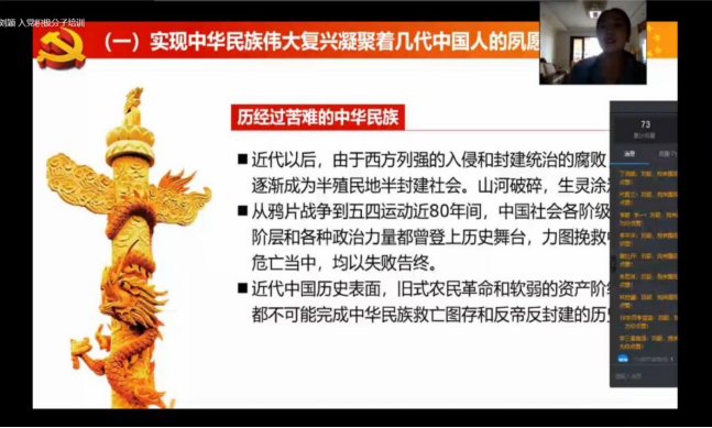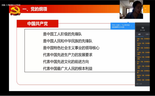 2020年6月23日,为加强第60期入党积极分子对党的纲领的学习,公司于线上开展了以《明确党的纲领,为实现最高理想和现阶段目标努力奋斗》为主题的党课第五讲。本堂党课由太阳成集团tyc151cc员工第一党支部书记刘颖同志讲授。本次培训的主要内容有:一、党的纲领。二、实现中华民族伟大复兴。三、习总书记寄语当代青年。