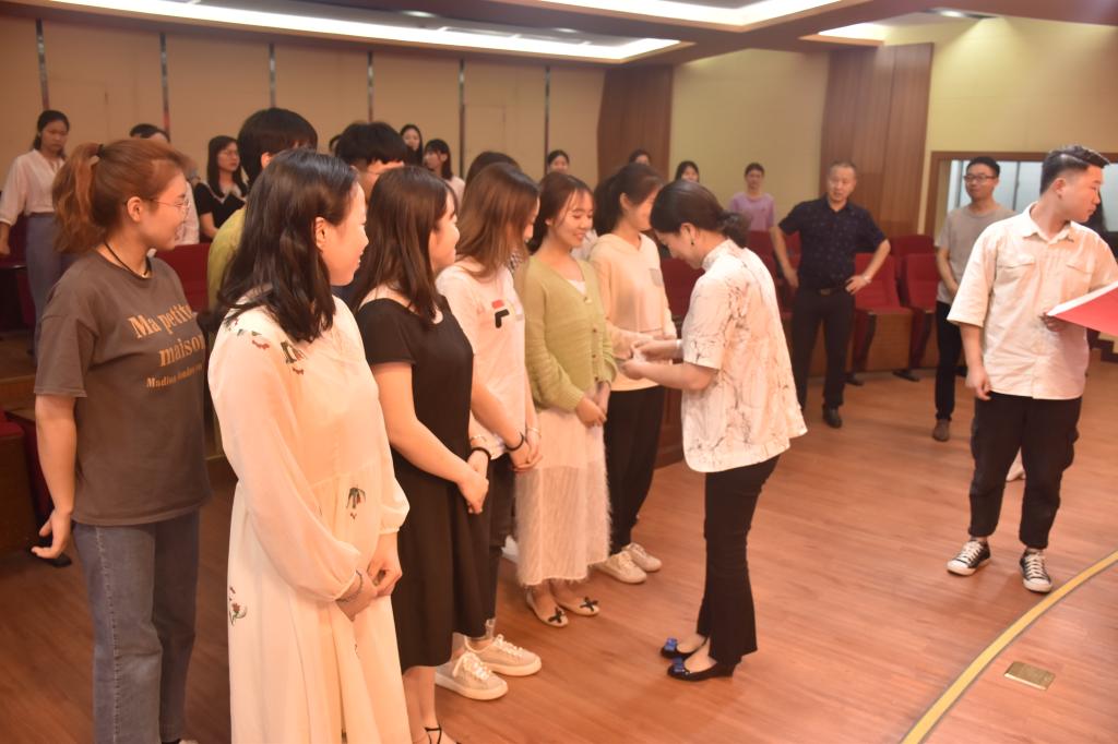 音乐公司党总支副书记陈雅斐为此次新发展的预备党员颁发党徽