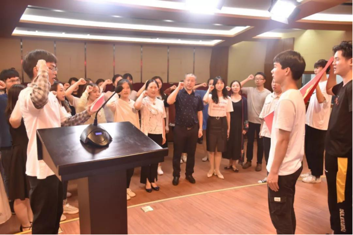 会议第五项,由音乐公司党总支副书记陈雅斐同志为此次发展的预备党员颁发党徽,之后,在员工第二党支部党员黄烽同志的带领下举起右手庄严宣誓,与会的其他党员重温入党誓词。