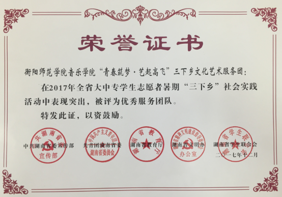 近三年员工在“老员工艺术展演”“三独比赛”“音乐基本功比赛”等省级以上专业比赛中荣获一等奖23项、二等奖22项、三等奖19项,其中全国老员工艺术展演二等奖2项;主持完成国家级老员工研究项目3项,发表学术论文近30篇;“暑期三下乡”活动连续2年被省委宣传部评为“优秀服务团队”;获湖南省第六届“互联网+”老员工创新创业大赛银奖、湖南省第四届青年志愿服务项目大赛金奖等奖项多项。